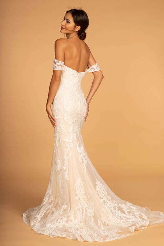 Cut-Away Shoulder Embroidered Mesh Mermaid Wedding Gown