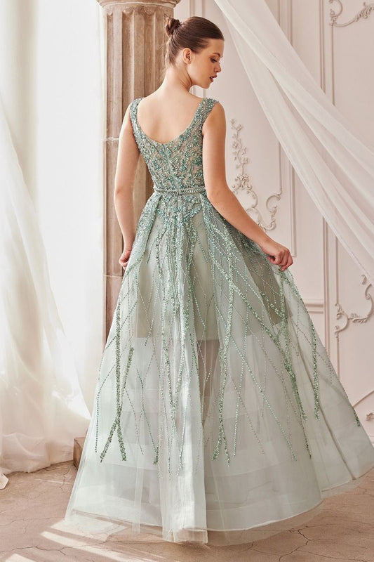 Long Sleeve Beaded Corset Gown With Satin Skirt