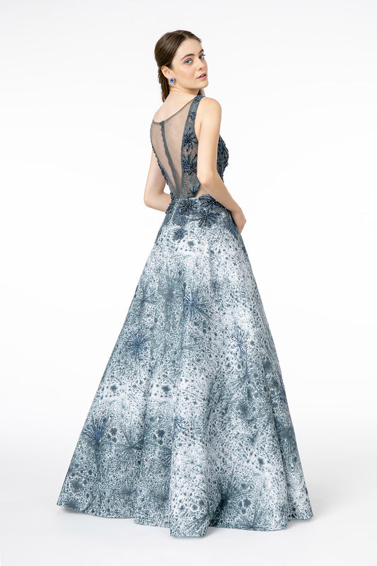 Jewel Embellished Sleeveless Illusion Deep V-Neck A-Line Long Dress