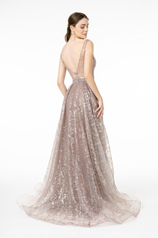 Embroidered Illusion V-Neck Mesh Long Dress w/ V-Back
