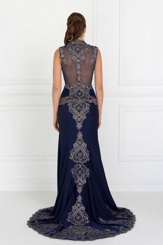 Rome Jersey Mermaid Long Dress with Metallic Embroidery
