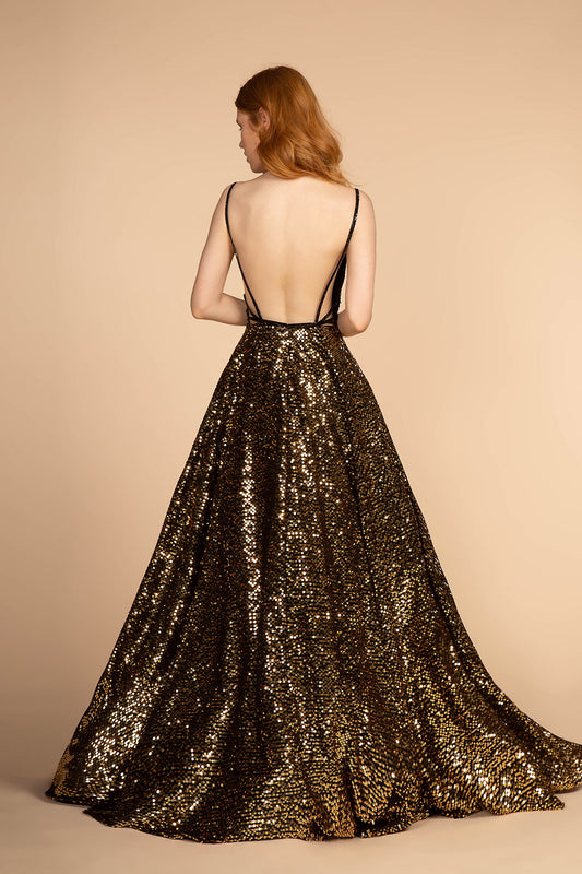 Illusion Deep V-Neck Sequin Ball Gown w/ Open Back