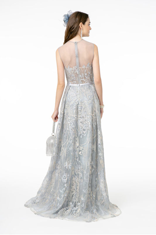 Jeweled Waist Band Accented Glitter Mesh Long Dress