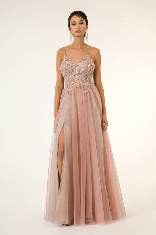 Beads Embellished Bodice V-Neck Mesh A-Line Prom Dress w/ Sheer Back - Mask Not Included