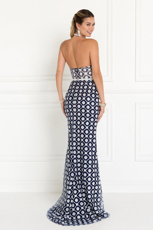 Embroidered Neck Halter Jersey Long Dress with Open Back
