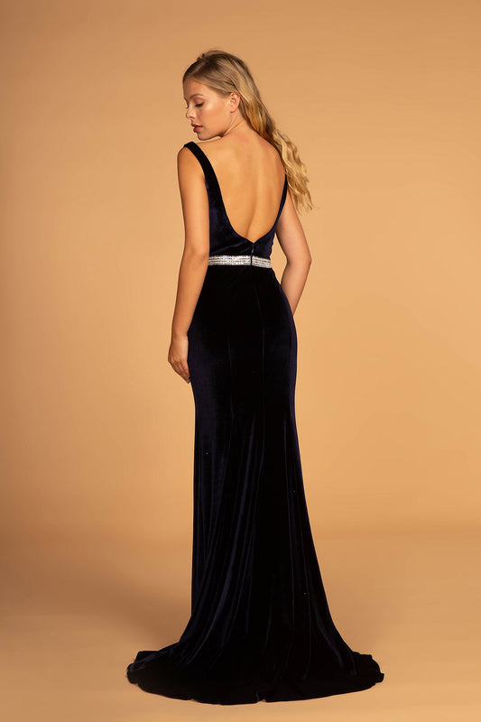 Jewel Accented Waist Line V-Neck Velvet Dress w/ U-Back