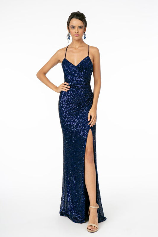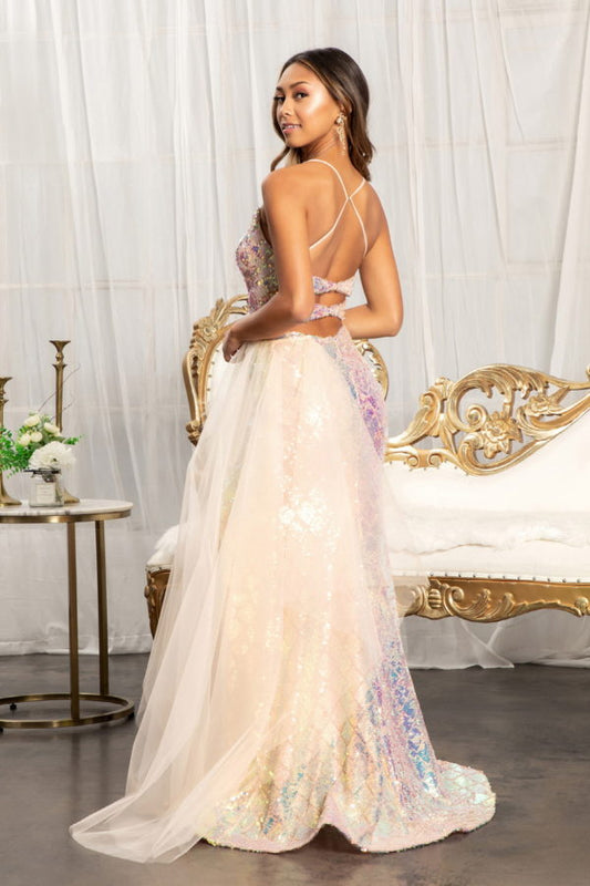 Full Iridescent Sequin Cut-Out Back Prom Dress w/ Detachable Mesh Layer