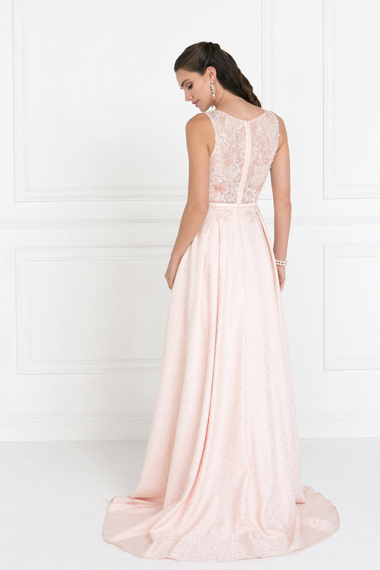 Embroidered Lace Top with Chiffon Skirt Long Dress with Sheer Back