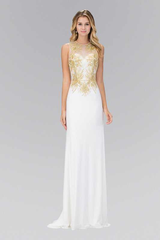 Sheer Back Floor Length Dress with Bead Embellished Bodice