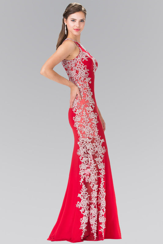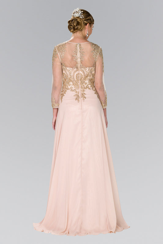 Floor Length Dress with Jewel Embellished Sheer Bodice and Back