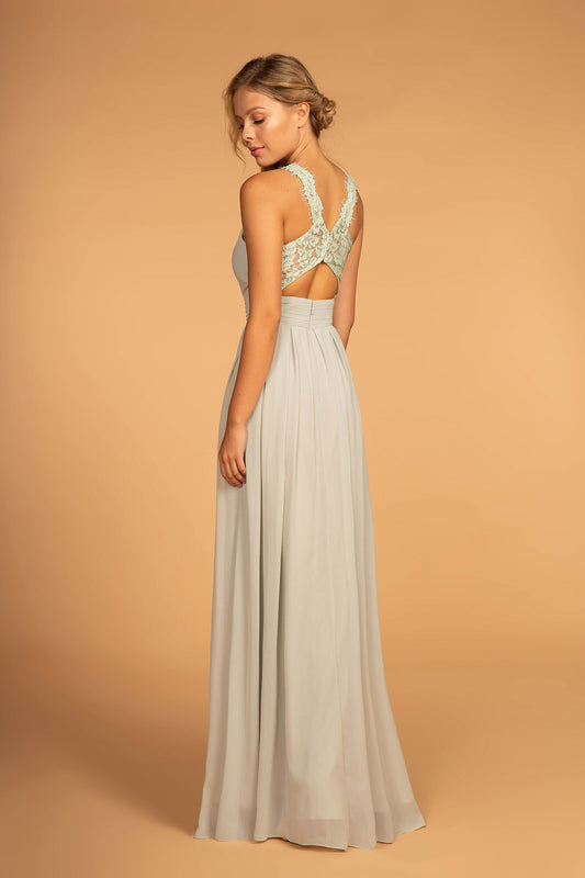 High-Neck Chiffon Ruched-Bodice A-Line Long Dress