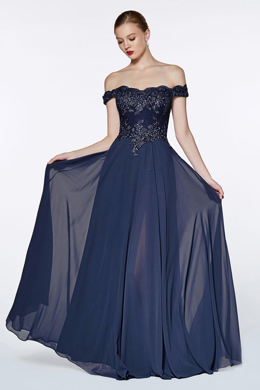 Off The Shoulder Lace Bodice Gown With Flowy Chiffon Bottom And Leg Slit In Lining.