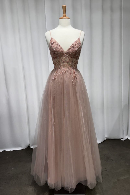 V-Neck Floral Embroidery Embellished Bodice Glitter Mesh Long Dress