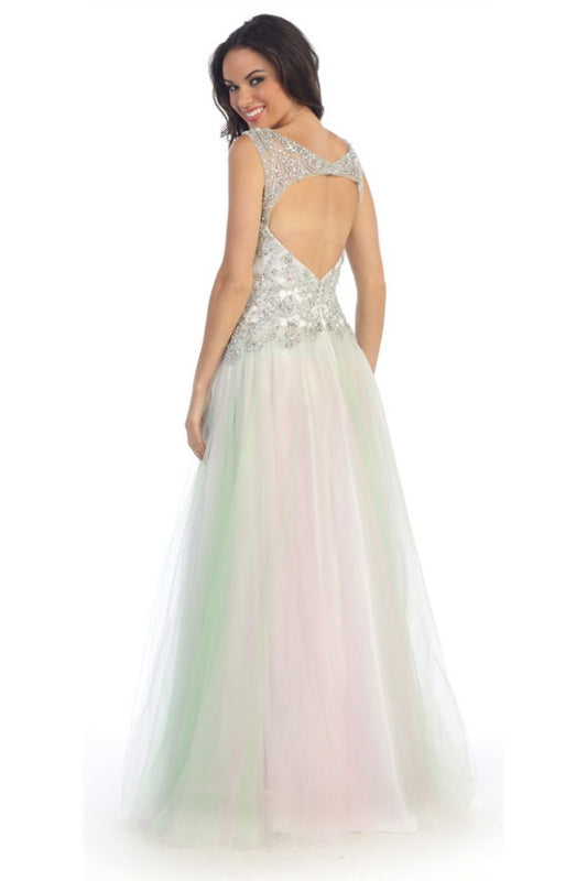 Sleeveless Tulle Long Dress with Bead Embellished Bodice and Neckline