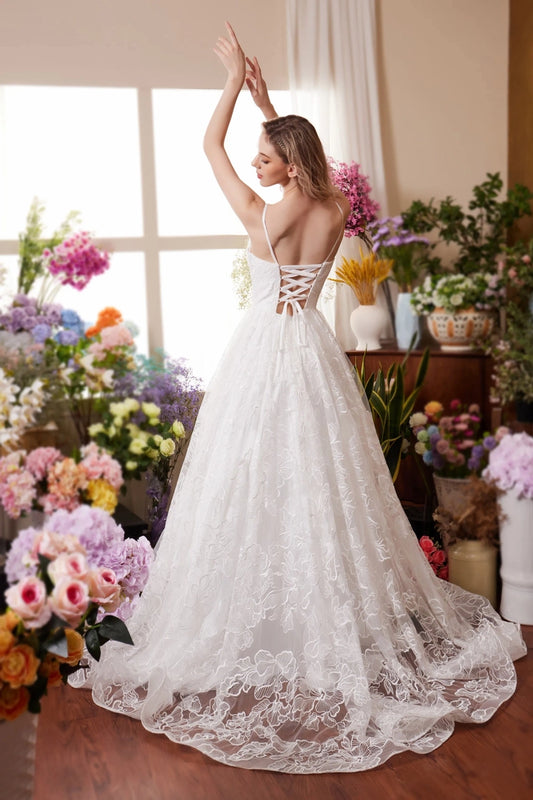 A-Line Wedding Gown A Sheer Corset Bodice With Lace Appliqué And Beaded Spaghetti Straps